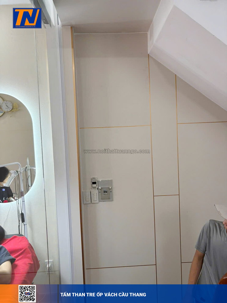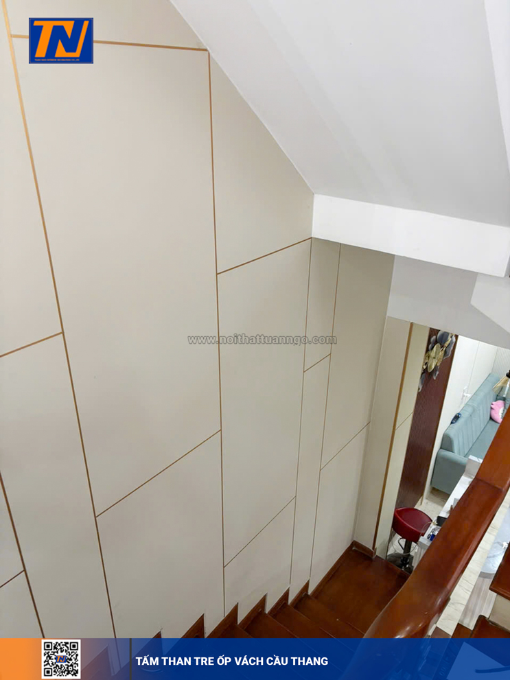 Vách cầu thang trở nên sang trọng, hiện đại và bền bỉ hơn với tấm ốp than tre iWood do Nội Thất Tuấn Ngô cung cấp và thi công. Chất liệu than tre cao cấp mang đến bề mặt sắc nét, chống ẩm, chống mối mọt, hạn chế trầy xước và giữ màu ổn định theo thời gian.