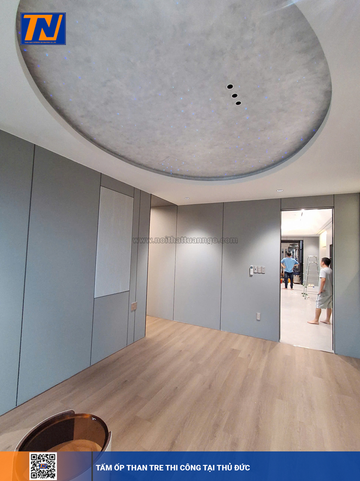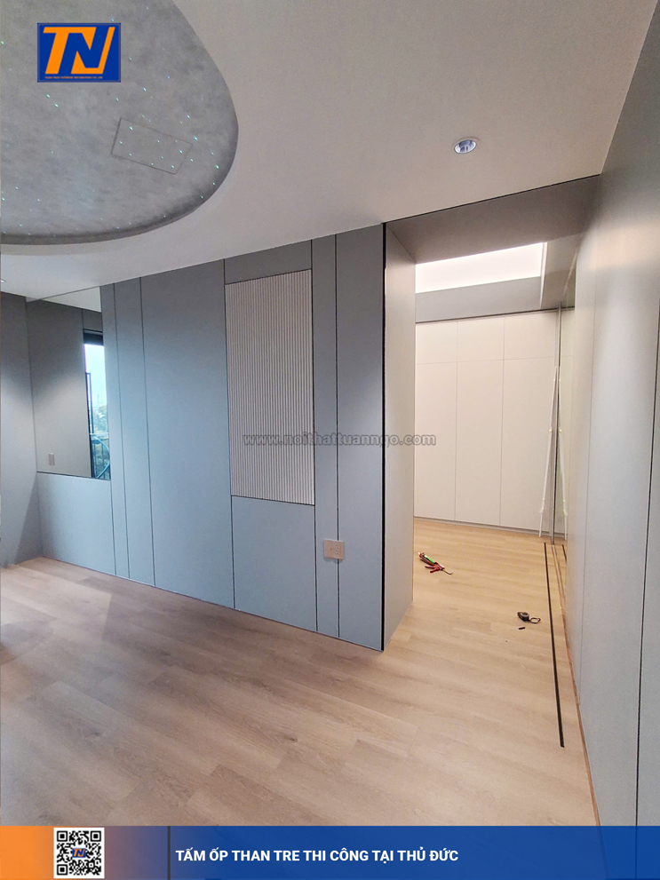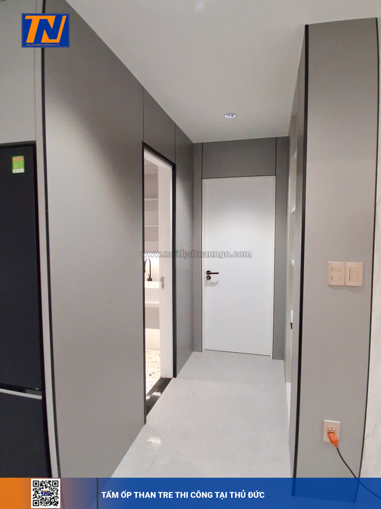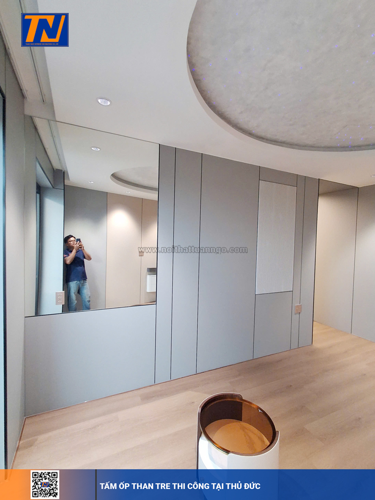 Ốp full tường bằng tấm than tre giúp không gian đồng nhất, sang trọng và dễ dàng phối hợp với các phong cách nội thất khác nhau – từ hiện đại đến cổ điển.
