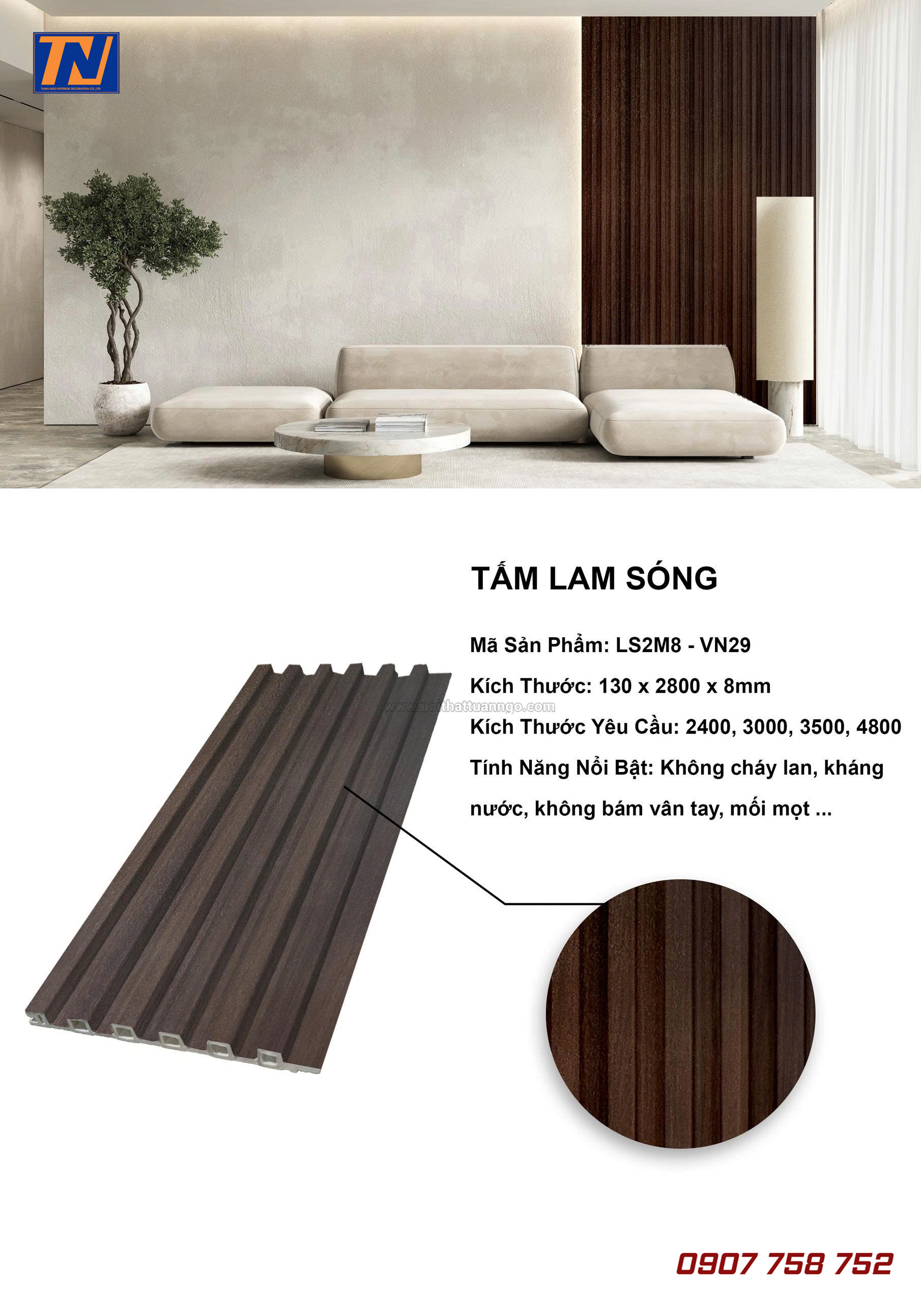Tấm lam sóng VNwall được sản xuất từ nhựa nguyên sinh cao cấp, có khả năng chống ẩm, chống mối mọt, bề mặt vân gỗ sắc nét, mang đến cảm giác ấm áp và tự nhiên cho mọi không gian.