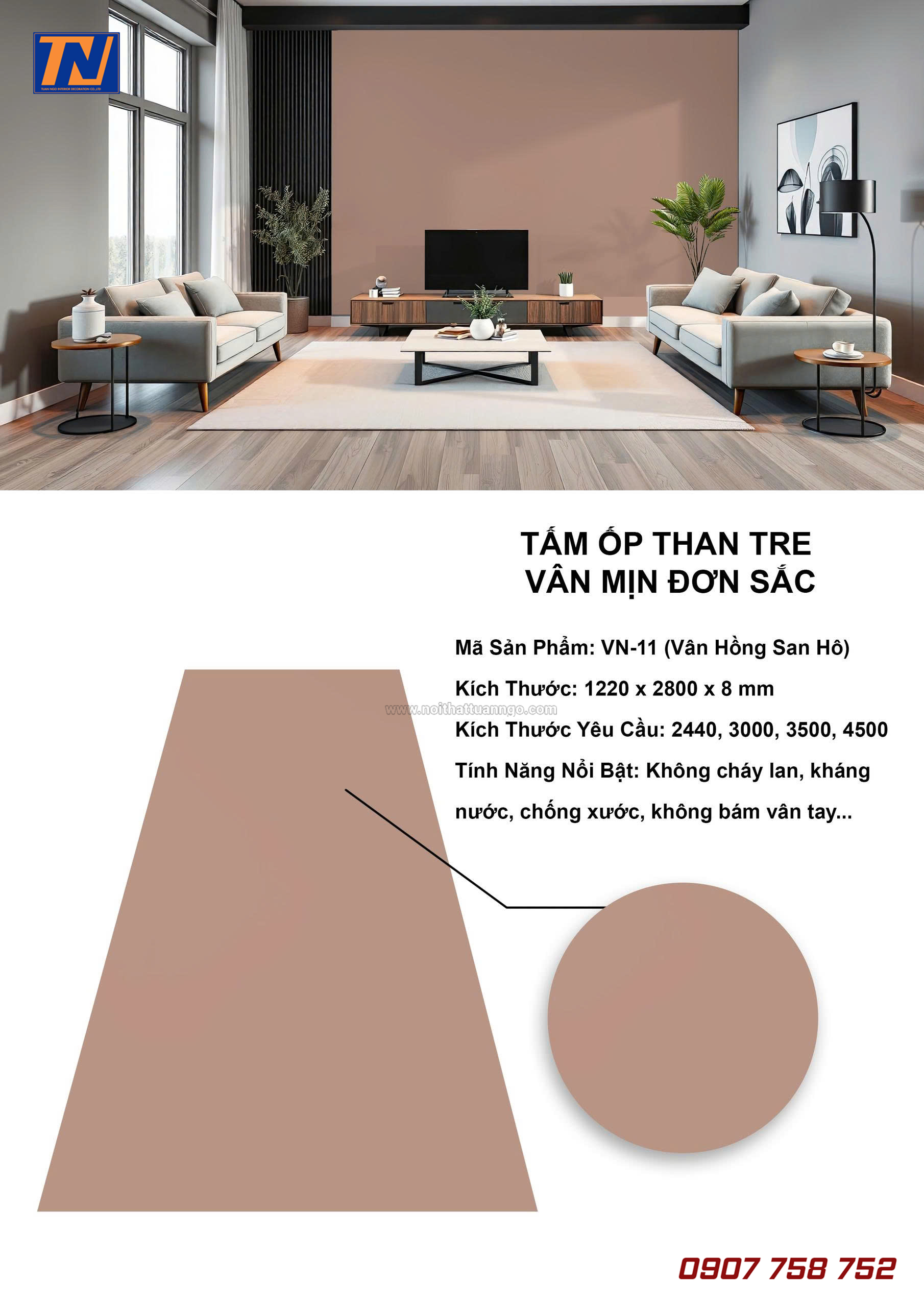 Tấm ốp VNwall được sản xuất từ bột tre tự nhiên kết hợp nhựa cao cấp, giúp chống ẩm, chống mối mọt, và an toàn cho sức khỏe. Với nhiều màu sắc, vân gỗ, vân vải, vân đá đa dạng, sản phẩm dễ dàng ứng dụng cho phòng khách, phòng ngủ, văn phòng, showroom hoặc các công trình cao cấp.