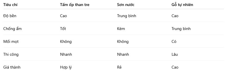 Qua bảng so sánh, có thể thấy tấm ốp than tre nội thất là lựa chọn cân bằng giữa chi phí và chất lượng.